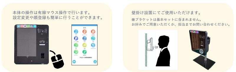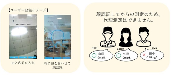 ![]() 1)使い捨てない据置型 ・定期的に校正を行う事で、使い捨てずに長く利用可能です。 ![]() 2)顔認証機能で不正防止 ・顔認証+スナップ写真保存で、代理測定などの不正を防止します。 ![]() 3)記録・データ管理が簡単