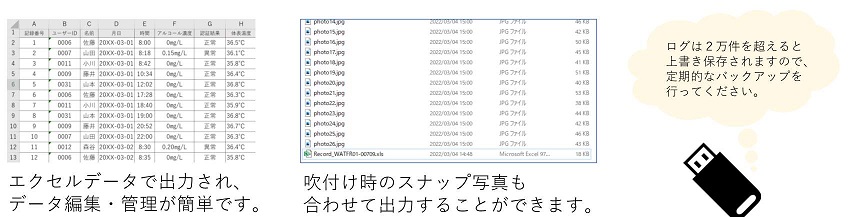 ・ログは本体に2万件保存可能、エクセル形式でのダウンロードが可能です。 ![]() ▼重大事故から社員を守りデータ管理も簡単に出来る。TSP-ALCCシリーズは社用車を持つ事業所の必須アイテムです!