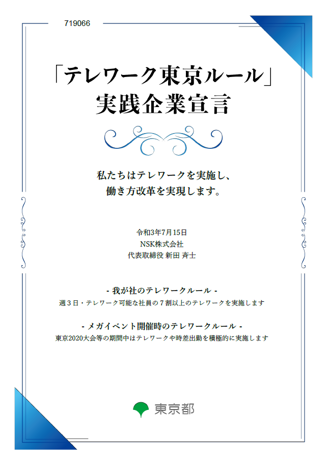 このたび、東京都が定めた「テレワーク東京ルール」実践企業宣言を行い、認定されました。